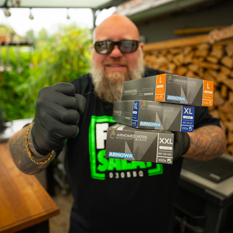 Die ARNOMED NITRIL MIDNIGHT BLACK Handschuhe in Midnight Black sind die ideale Wahl für alle Grillmeister und Köche, die Wert auf Qualität und Präzision legen. Die passgenaue Form und die texturierten Fingerspitzen sorgen dafür, dass Sie selbst feinste Arbeiten, wie das Marinieren oder das Platzieren empfindlicher Speisen, mühelos meistern.