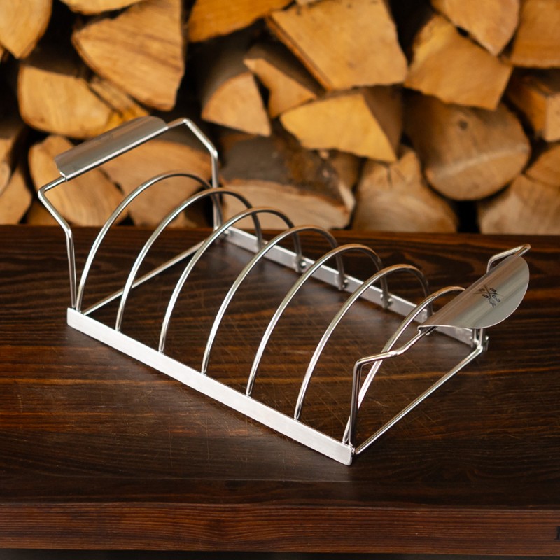 Mit demSpare Rib Halter BBQ inkl. 030 BBQ Branding kannst du bis zu 6 Spare Ribs gleichzeitig grillen. Der Halter aus hochwertigem Edelstahl eignet sich perfekt für den Kugelgrill oder Backofen.