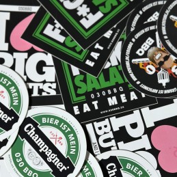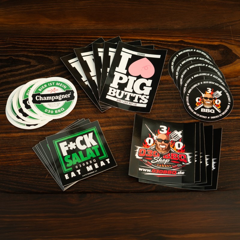 Dit 030 BBQ Stickerbomb-Paket is der absolute Hammer für alle Fans von Bobby ! Im Paket findste allet, wat dit Herz begehrt: Von unserm legendären F*CK SALAT Logo über die kultigen PIG BUTTS Sticker bis hin zum stylishen BIER IST MEIN CHAMPAGNER Aufkleber. Natürlich dürfen ooch die klassischen 030 BBQ Face und Shop Logo Sticker nicht fehlen ! Jede Menge Sticker perfekt für deine Grillsachen, Kühltaschen, Bierkisten oder wo ooch imma du’n Hingucker brauchst. Also, ran an dit Paket und mach allet schön 030 BBQ-mäßig schick !