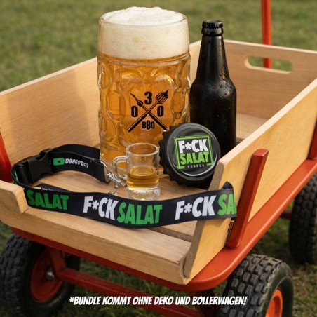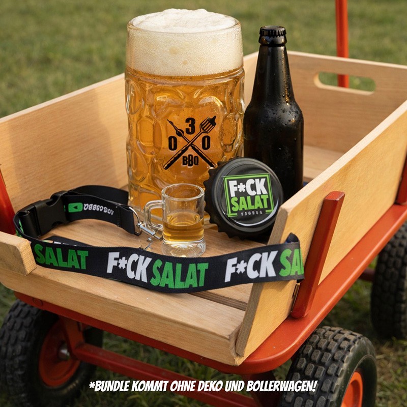 Das 030 BBQ Vatertagsbundle liefert dir alles, was du für einen ehrlichen Männertag brauchst: 1L 030 BBQ Bierkrug, F*ck Salat Flaschenöffner-Magnet und Shotglas mit Schlüsselband.